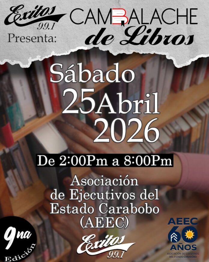 Éxitos 99.1 FM emisora del circuito Unión Radio, invita a la novena edición del “Cambalache de Libros”, a celebrarse el sábado 25 de abril, a partir de las 2:00 de la tarde en los espacios de la Asociación de Ejecutivos del Estado Carabobo (Aeec).